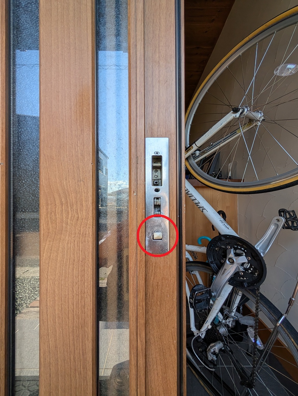 写真の赤丸部分の部品が劣化していて引戸に当たり、カラカラと音を