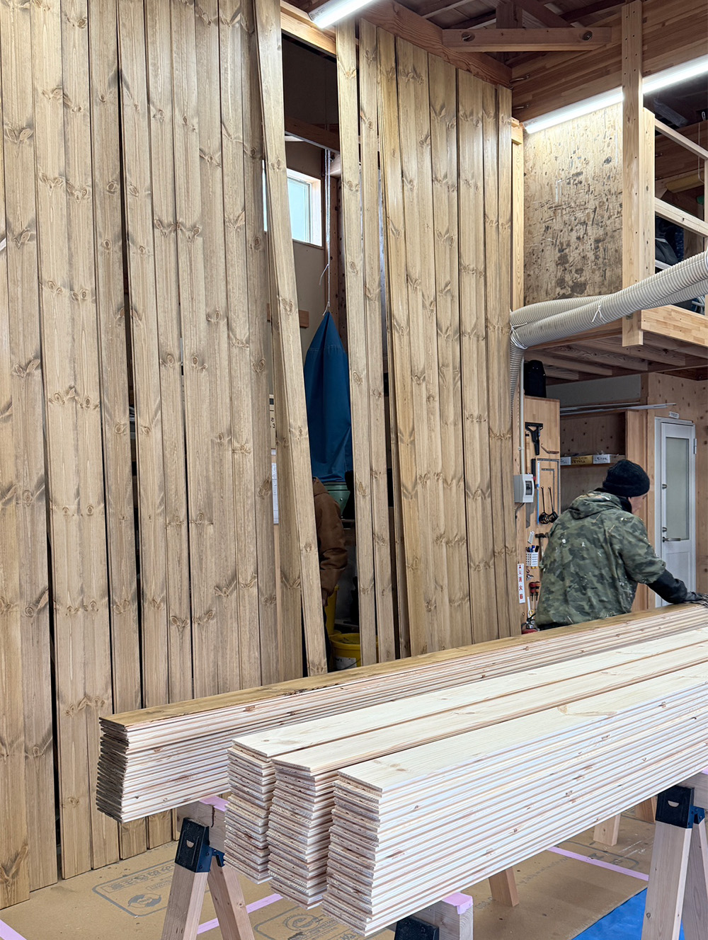 塗装屋さんが無垢フローリングの塗装をしてくださっていました。